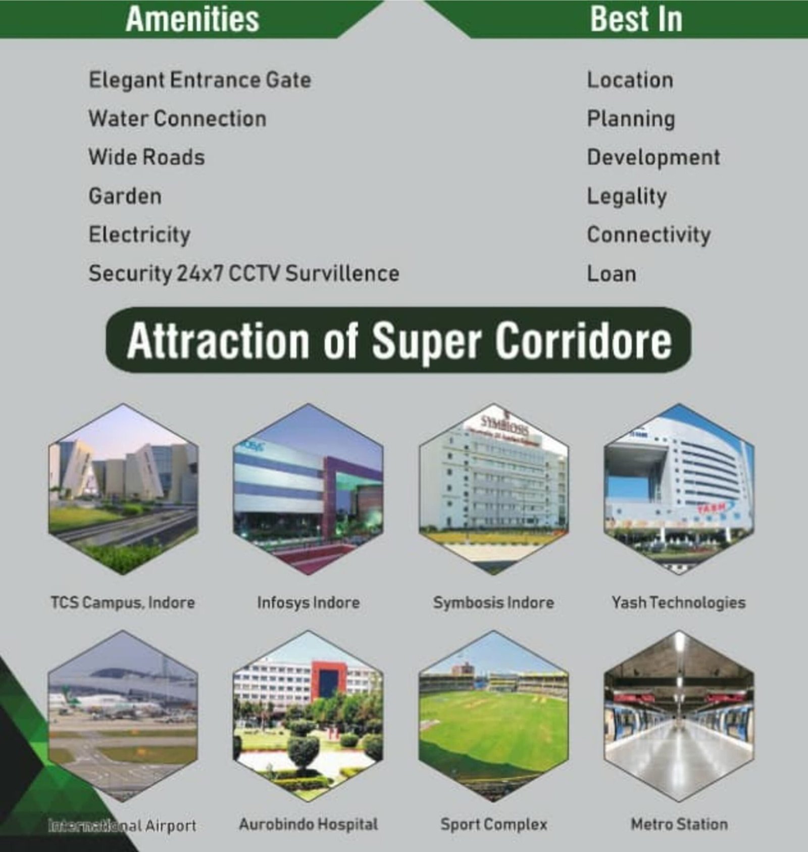 Brief description:- distance from tcs campus, from metro station to project only 2.5km approx., 300meter approx. Distance from 300ft wide road ( ahilya path) , covered campus, gated society, 9meter wide roads, 24/7 hours cctv and security surveillance, gardens , underground water tank, kids play area, walking track, jogging track , gathering space , meeting space for society meeting , zumba & yoga , open gym area , sitting chairs , underground electricity, overhead water tank, basket ball hall , bet minton , volleyball.